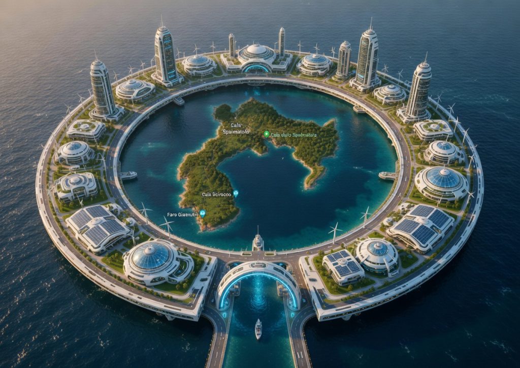 The main project concept involves a floating city around the island in a horseshoe format, with bridges connecting the mainland. We wish to preserve the island as much as possible, therefore keeping its natural look as a kind of nature reserve. There will also be a sea port and airport with landing strips leading out from the floating city. All designs and development will be in accordance with international law and international waters.